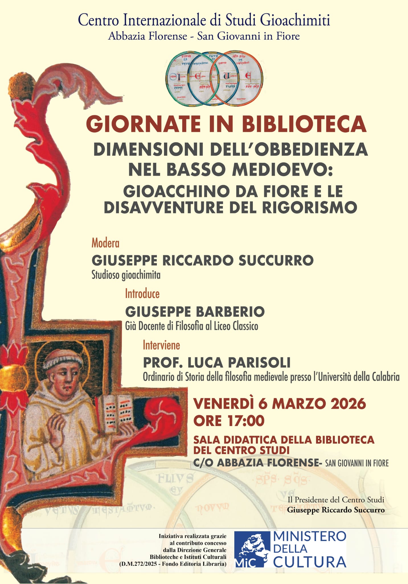 Venerdì 6 marzo 2026, alle ore 17:00, nella Sala didattica della Biblioteca del Centro Internazionale di Studi Gioachimiti si terrà un seminario su “DIMENSIONI DELL’OBBEDIENZA NEL BASSO MEDIOEVO: GIOACCHINO DA FIORE E LE DISAVVENTURE DEL RIGORISMO”. La relazione sarà svolta dal prof. Luca Parisoli, ordinario di Storia della filosofia medievale presso l’Università della Calabria. I lavori saranno moderati dal Presidente del Centro Studi prof Giuseppe Riccardo Succurro e introdotti dal prof Giuseppe Barberio, già docente di Filosofia al Liceo Classico. L’iniziativa è realizzata grazie al contributo concesso dalla Direzione Generale Biblioteche e Istituti Culturali del Ministero della Cultura. Il seminario affronta questioni storico-teologiche importanti: